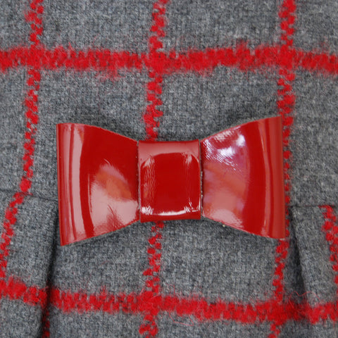 Dress from the Ambarabà girl's clothing line with checks in red tones. Collar In striped plain color. Faux leather bow at waist. Pleated skirt. Closure with zipper at back.