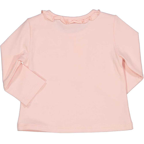 T-shirt from the Birba Girls' Clothing Line, featuring ruffles at the neckline and a cute embroidered pocket on one side.