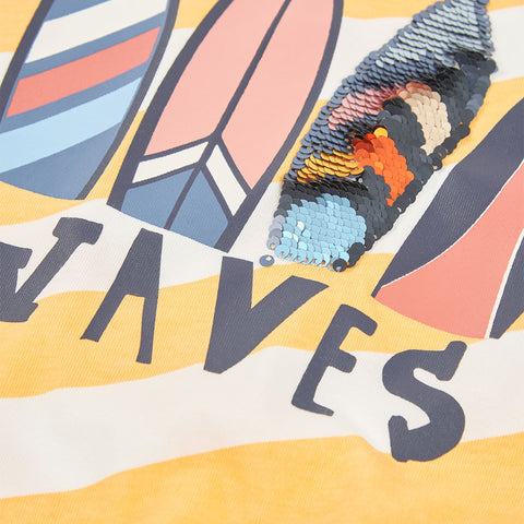 T-shirt from Boboli Children's Clothing Line, with striped pattern and colorful surf print on the front.