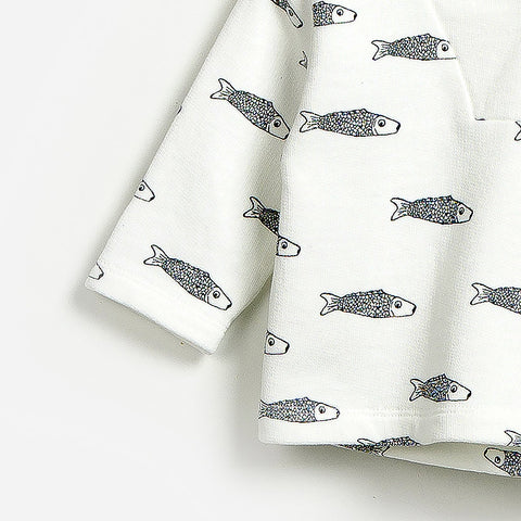 Sweatshirt from the Play Up children's clothing line. With hood and cute little wooden button. Beautiful fish over all fantasy. Composition:100% COTTON