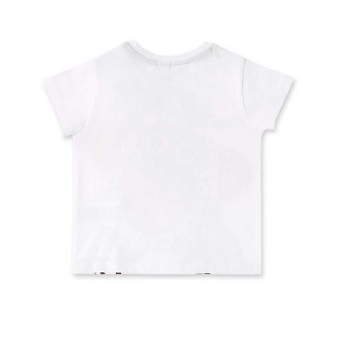 Short-sleeve T-shirt from the Tuc Tuc Children's Clothing Line, with snap buttons on the shoulder and a colorful print on the front.