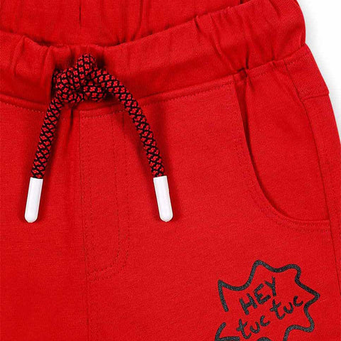 Shorts from the Tuc Tuc Children's Clothing Line, featuring small front pockets, drawstrings, and an elastic waistband. Cuffed hems and a small print on one side.