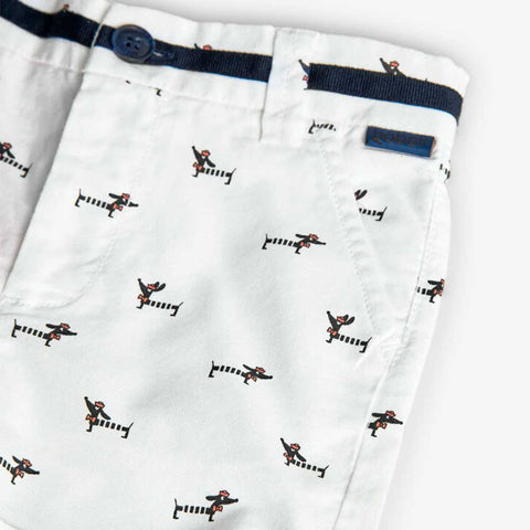 Short of the Children's Clothing Line Boboli, with a pattern of small dogs on a white background. Adjustable waist size and gros grain detail on the belt.