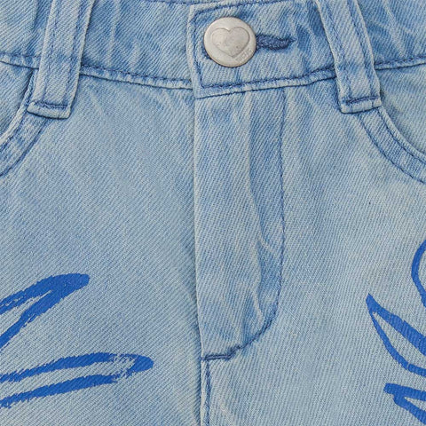 Jeans shorts from the Tuc Tuc Girls' Clothing Line, loose fit, with adjustable waist size. Colorful prints on both sides.