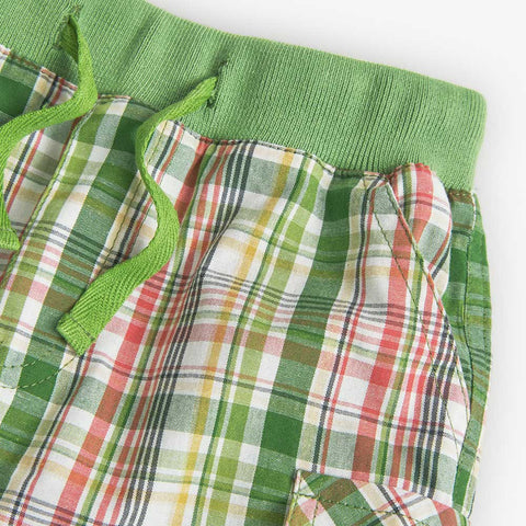 Shorts from the Boboli children's clothing line, with pockets on the sides with small buttons. Elastic waist with drawstrings and all-over checked pattern.