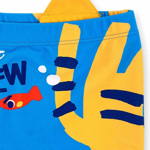 Boxer shorts for boys from the Tuc Tuc Children's Clothing Line, featuring a multicolor pattern and fabric crest appliqué on one side.