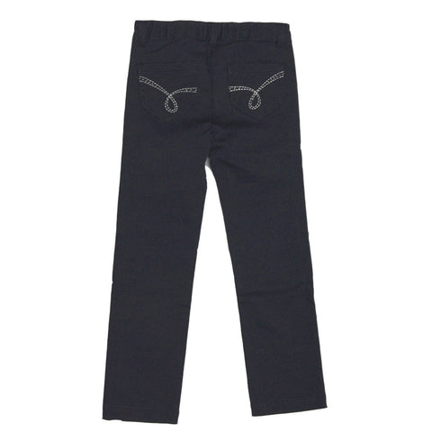 Satin pants from the Mirtillo girl's clothing line. Solid colour model five pockets. Back pockets with silver embroidery. Adjustable size inside.