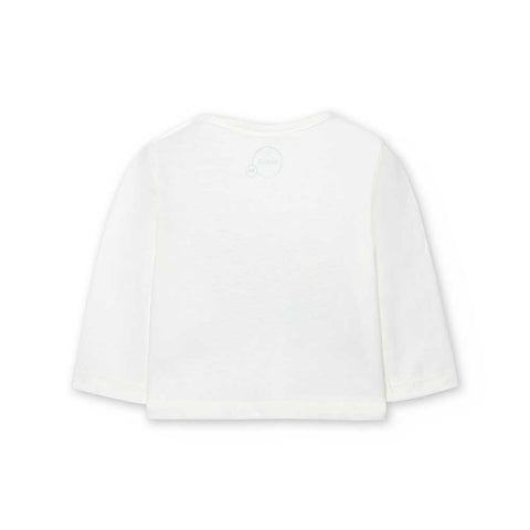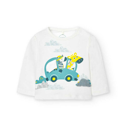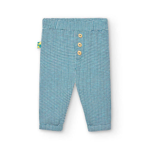 Two-piece suit from the Boboli children's clothing line, with drop crotch trousers and checked pattern; Long-sleeved t-shirt with press studs on the shoulder and colorful print on the front.