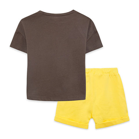 Two-piece suit from the tuc Tuc children's clothing line, Fancactus collection, composed of t-shirt with print on the front, buttons on the shoulder strap and shorts with drawstring at the waist.