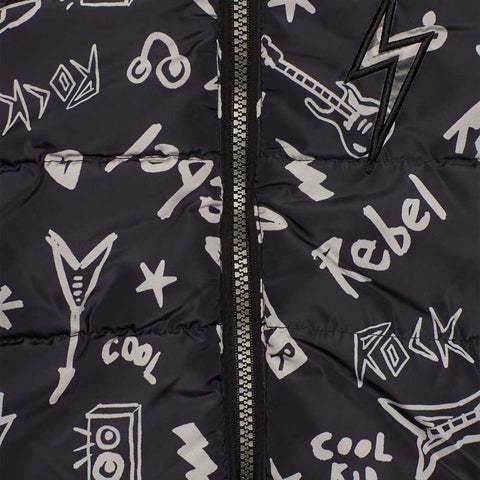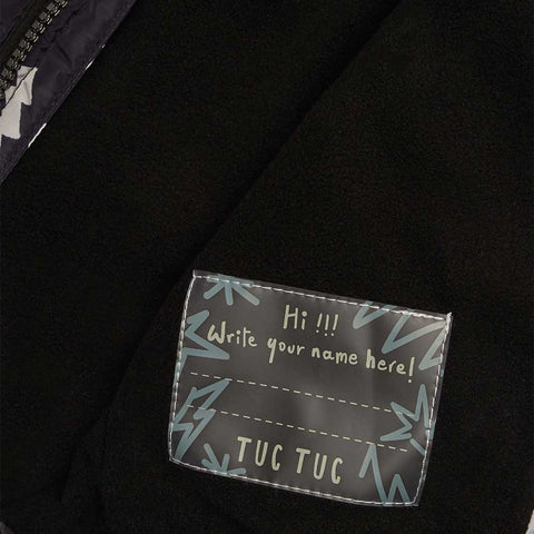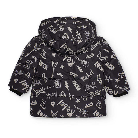 Jacket from the Children's Clothing Line Tuc Tuc, with micro-pattern all over on a black background, with hood and zip closure.