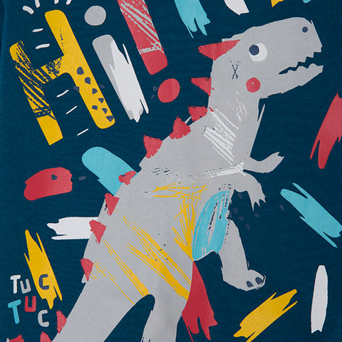 Two-piece suit from the Tuc Tuc Childrenswear Line consisting of shorts with elastic waistband and laces and t-shirt with buttons on the shoulder and print of dinosaur on the front.