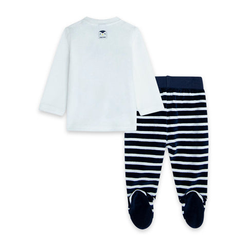 Two-piece suit from the Tuc Tuc children's clothing line, It's cold collection. Composed of striped trousers and sweater with embroidery on the front and press studs on the back.