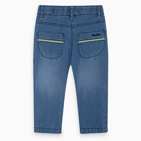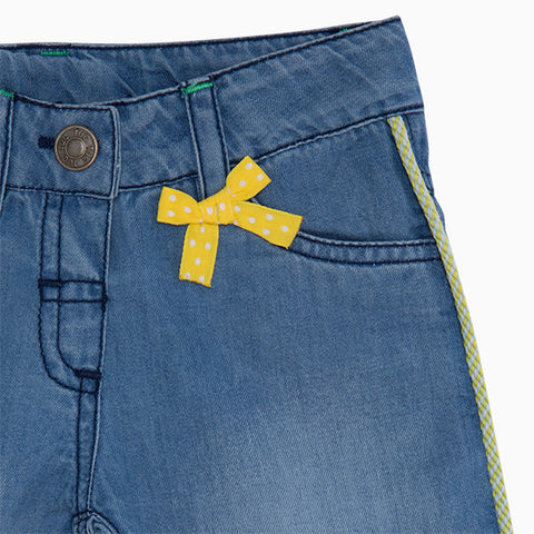 Lightweight denim trousers from the Tuc Tuc girl's clothing line, with a bow in fabric applied on a small pocket and fabric border on the sides.