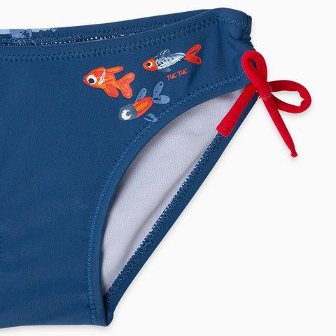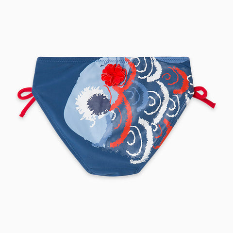 Swim briefs from the Tuc Tuc Girl's Clothing Line with bows on the sides and small colored print on one side.