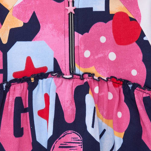 Dress from the Tuc Tuc Girls' Clothing Line, in sweatshirt fabric with a hood, wide skirt, and multicolor all-over pattern.