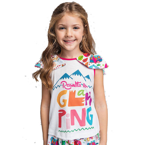 Top of the Rosalita Senoritas girl's clothing line, with bows on the shoulder straps, and colorful designs on the front.