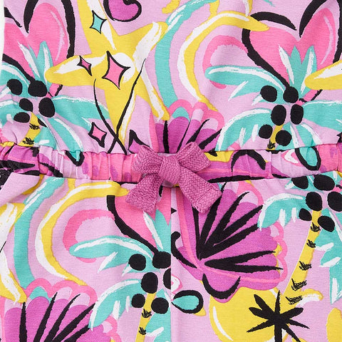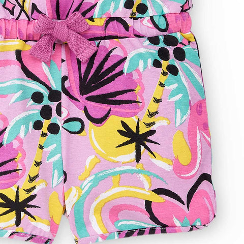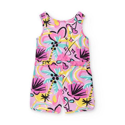 Short jumpsuit from the Tuc Tuc Girls' Clothing Line, with elastic and drawstrings in viat. Deeper neckline at the back. Colorful all-over pattern.