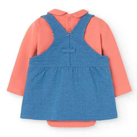 Two-piece outfit from Boboli Girls' Clothing Line, featuring striped skirt dungarees with embroidery on the front, plain T-shirt with round collar.
