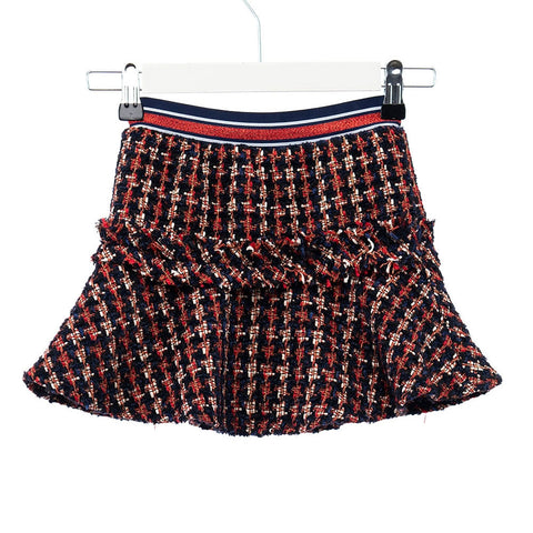 Wide skirt model of the Rosalita Senoritas girl's clothing line, in tartan patterned fabric, with elastic waistband with glitter coloured strings. Composition: WOVEN, 100%POLYESTER