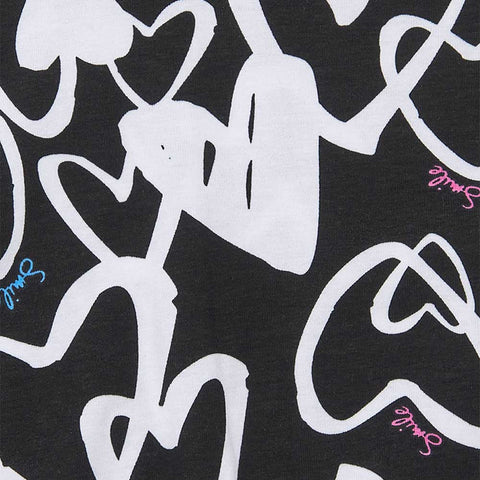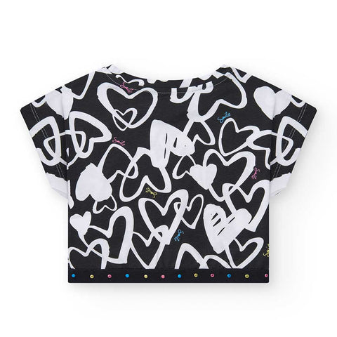 Short t-shirt from the Nath Kids Girls' Clothing Line, with an elastic hem and a square cut featuring a white floral pattern on black.