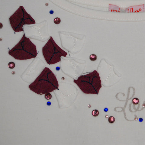 Asymmetrical T-shirt from the Mirtillo girl's clothing line. Solid color. Sullo neckline applications in printed fabric illuminated by sequins and application of colorful rhinestones.