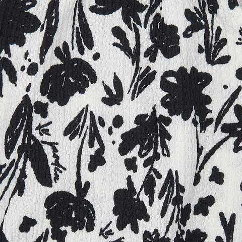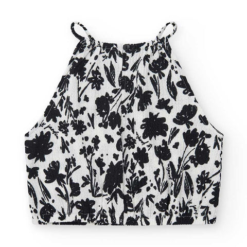 Short top from the Nath Kids Girls' Clothing Line, with short straps and a round neckline. Black floral pattern on white.