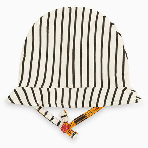 Cap from the Tuc Tuc girl's clothing line, with laces under the chin and striped pattern, with colored application on the front.