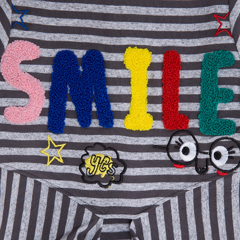 T-shirts from the Girls' Clothing Line Tuc Tuc with snap buttons on the back, striped pattern and multicolored embroidery on the front.