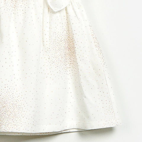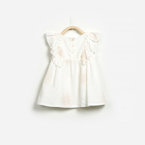 Little girl's dress from the Play Up clothing line. Sleeveless with voilantes on the front and patterned with small golden tips on a light background. Composition: 100% VISCOSE