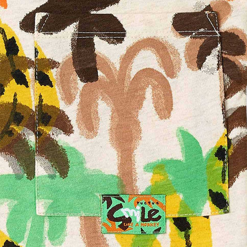 T-shirt from the tuc tuc Children's Clothing Line, with a front pocket, snap buttons on one shoulder, and a vibrant all-over pattern.