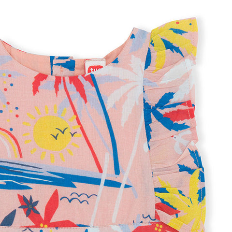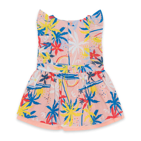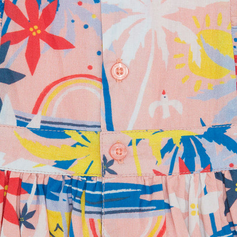 Dress from the Tuc Tuc Girl's Clothing Line, enjoy the sun collection, with tropical pattern on pink background. Wide skirt with petticoat. Cut on the hips and buttons on the back.
