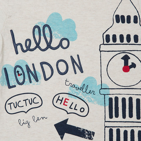 T-shirt from the Tuc Tuc children's clothing line, Hello London collection. With colorful print on the front and press studs on the shoulder strap.