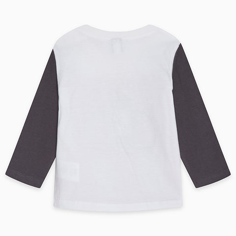 T-shirts from the Children's Clothing Line Tuc Tuc with snap-on buttons on the shoulder strap and multicolored designs with embroidery on the front.