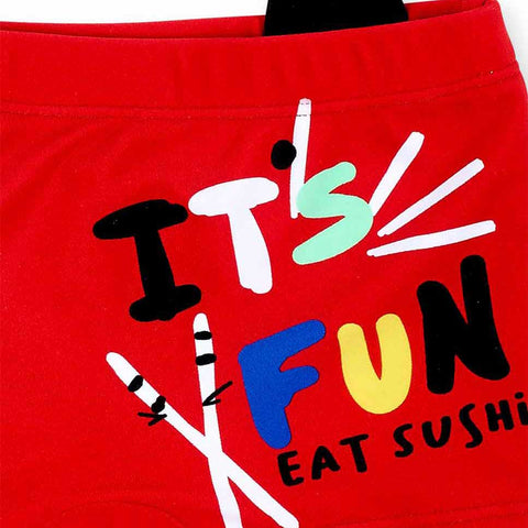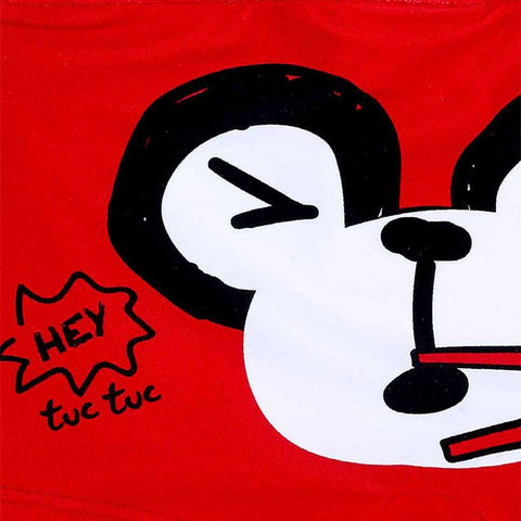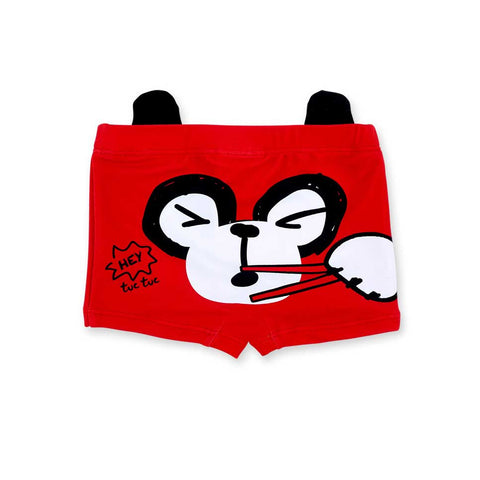 Boxer brief swimsuit from the Tuc Tuc Children's Clothing Line with a colorful print on the front and small fabric ears attached on the back.