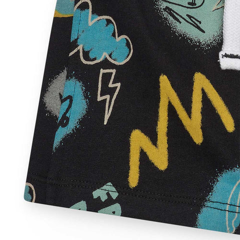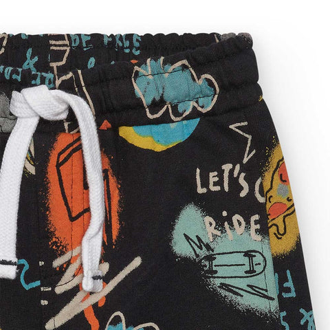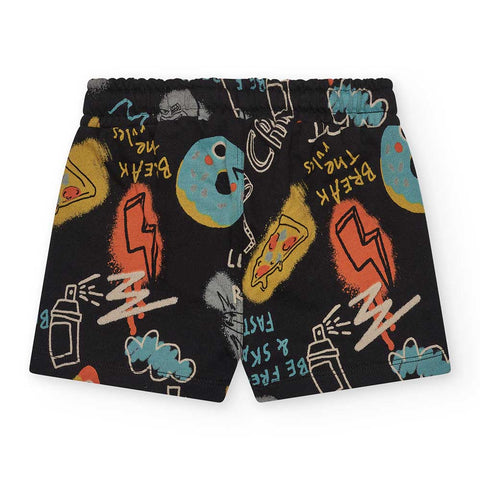 Tuc Tuc Children's Clothing Line bermuda shorts, made of sweatshirt fabric with drawstrings at the waist and multicolor pattern on a black background.
