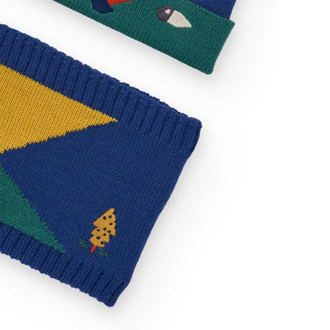 Set of the Children's Clothing Line Tuc Tuc, consisting of a hat with pom pom and embroidered eyes and a neck warmer with fleece inside.