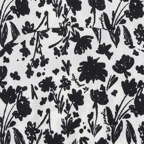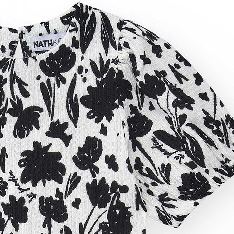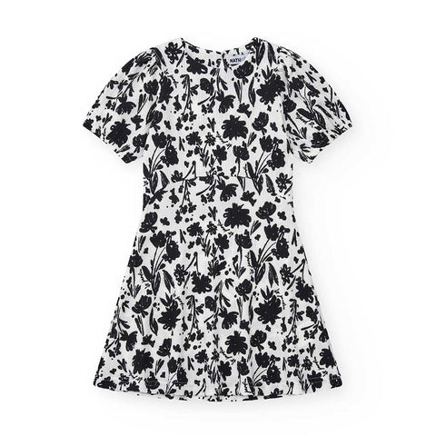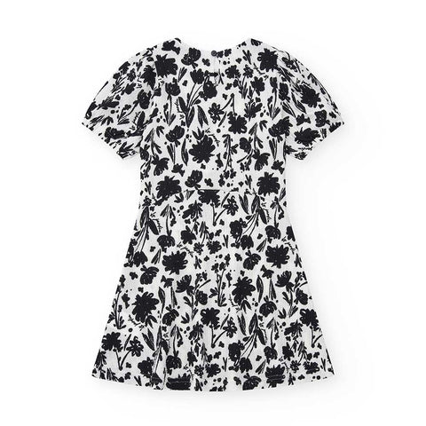 Dress in crepe from the Nath Kids Girls' Clothing Line, with a black floral pattern on white.