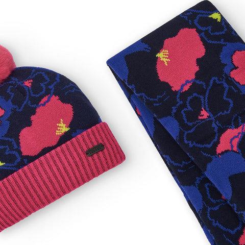 Set from the Tuc Tuc girls' clothing line, consisting of a hat with pom pom and floral patterned scarf in bright colours.