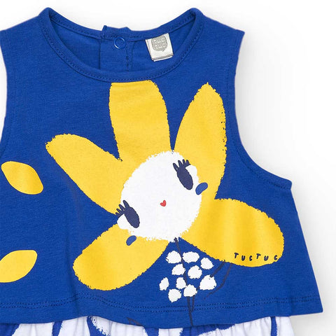 Tuc Tuc Girl's Clothing Line dress with a wide patterned skirt and a solid color top with a print on the front.