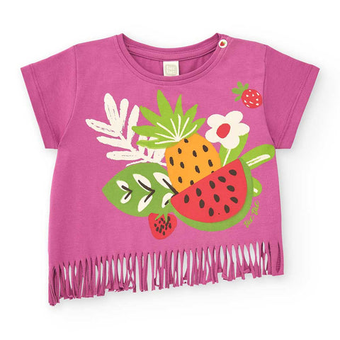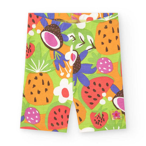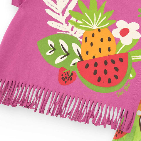 Complete two-piece set from the Tuc Tuc Girls' Clothing Line, consisting of a short t-shirt with fringes at the bottom and multicolor patterned cycling shorts.