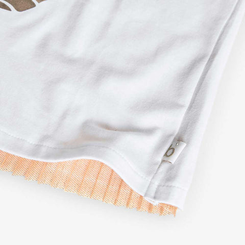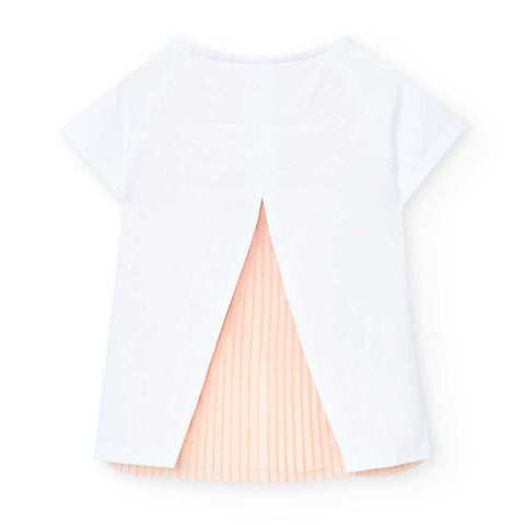 T-shirt della Linea Abbigliamento Bambina Boboli, con apertura sul dietro e plissè dorato. Davanti stampa glitter su un lato.
