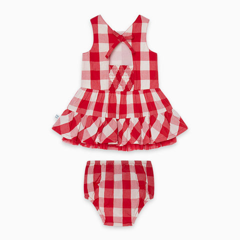 Dress from the Tuc Tuc Girl's Clothing Line with wide flounced skirt and red checked pattern. Coulotte coordinated up to 24 months.
