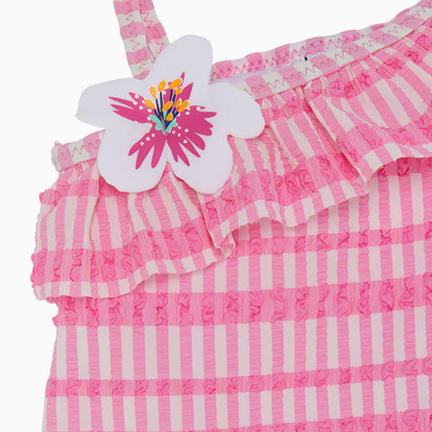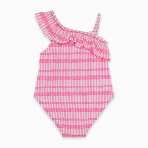 One-piece swimsuit from the Tuc Tuc Girl's Clothing Line asymmetrical model with rouches attached on one side; all-over pattern.