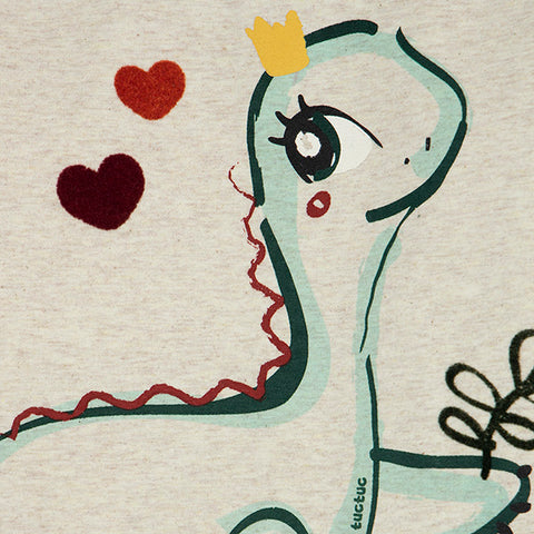 Long-sleeved T-shirt from the Tuc Tuc children's clothing line, Highlands collection; with riccetto on the shoulder strap and cute dinosaur on the front.