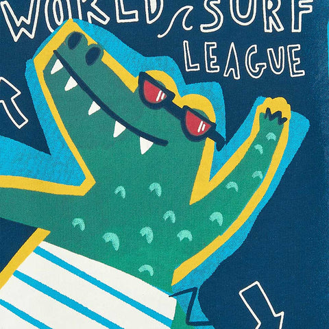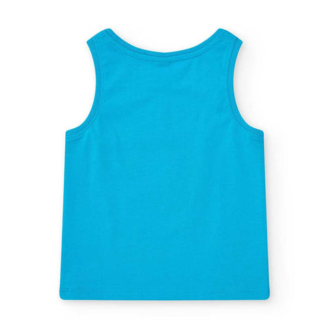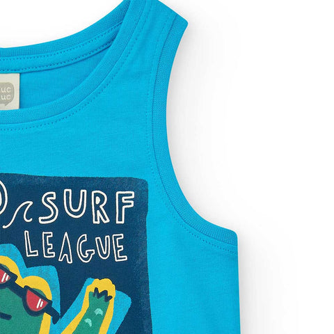 Tuc Tuc Children's Clothing Line beach tank top, with a crocodile print on the front on a light blue background.
