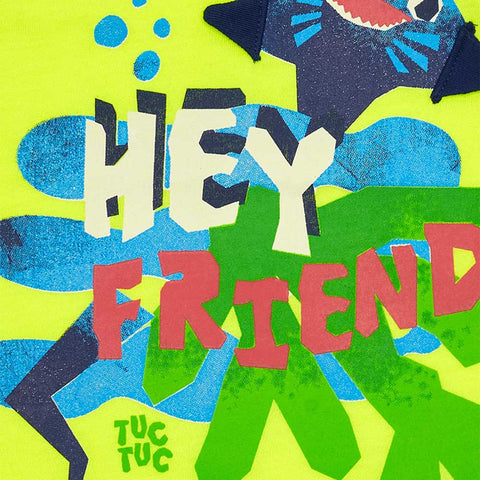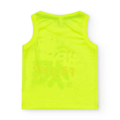 Tuc Tuc Line Children's Clothing Collection tank top, with colorful print on a fluorescent background and fabric applications.