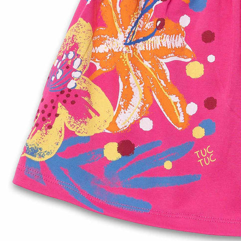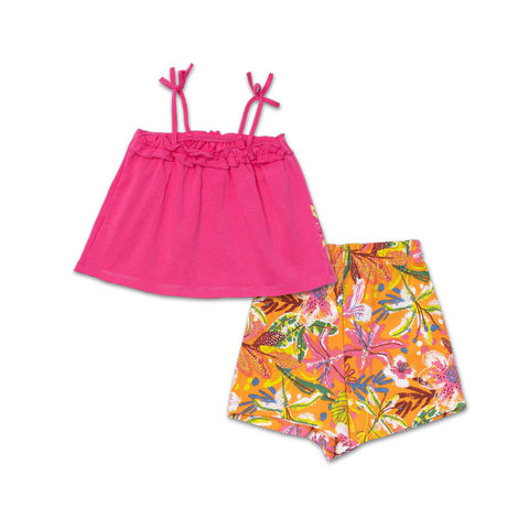 Two-piece beach set from the Tuc Tuc Girls' Clothing Line featuring a spaghetti strap top with a colorful print on the front, and patterned shorts.