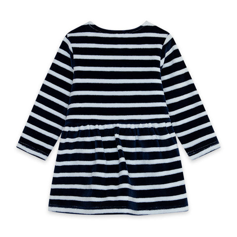 Chenille dress from the Tuc Tuc girl's clothing line, It's cold collection. with snap buttons on the back, and all-over striped pattern.