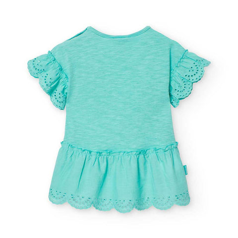 Abitino della Linea Abbigliamento Bambina Boboli, con taschino sul davanti ed applicazioni colorate. Sulle maniche e sul fondo pizzo traforato. Coulotte abbinata nelle taglie piccole.