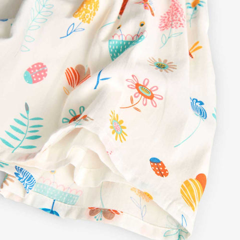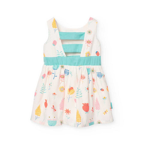 Abitino della Linea Abbigliamento Bambina Boboli, con taglio particolare sul dietro, cinturino in vita in contrasto di colore, fantasia in colori tenui all-over. Coulotte abbinata nelle taglie piccole.